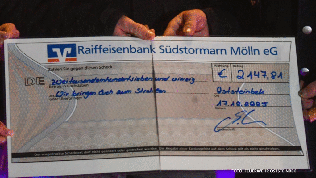 Die Scheckübergabe der in Oststeinbek gesammelten 2.147,81 Euro erfolgte am Mittwochabend. Mike Heth nahm den Scheck stellvertretend für die Initiative entgegen.