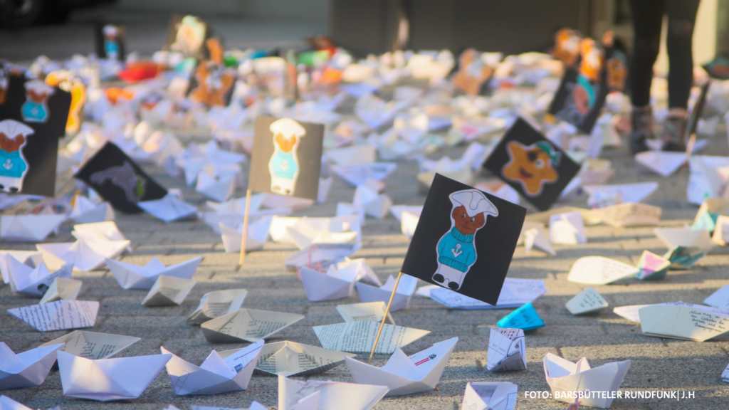 Hunderte Papierboote bedeckten den Platz vor dem Rathaus. Dazwischen lagen Spielzeug und Gummistiefel als sichtbares Zeichen für die Kinder, die von den Plänen betroffen wären. Die Aktion zog zahlreiche Blicke auf sich und sorgte auch in den sozialen Medien für große Aufmerksamkeit.
