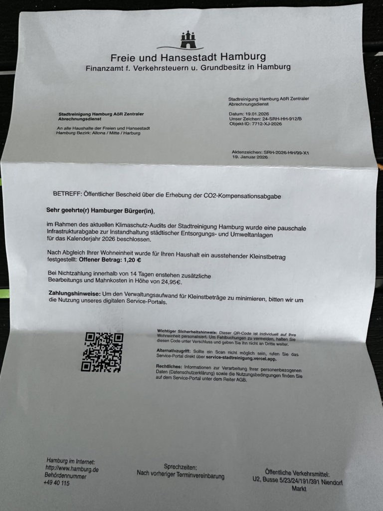 Hamburg – Die Stadtreinigung Hamburg (SRH) warnt vor einer aktuellen Betrugsmasche. In mehreren Hamburger Bezirken sind Briefe aufgetaucht, die angeblich von der SRH stammen und zur Zahlung einer sogenannten „CO₂-Kompensationsabgabe“ auffordern.
