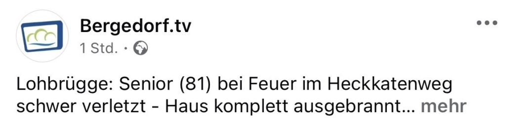 Hamburg-Lohbrügge – Eigentlich berichten wir nur selten über Einsätze außerhalb unseres eigentlichen Berichtsgebiets und überlassen die ausführliche Berichterstattung in solchen Fällen gerne den lokalen Medien. Der Brand im Heckkatenweg in Hamburg-Lohbrügge am Sonntagmorgen hatte jedoch Auswirkungen bis in unsere Region und ist daher auch für unsere Leser relevant. Noch Stunden nach dem Feuer war in Billstedt, Oststeinbek und Glinde deutlicher Brandgeruch wahrzunehmen.