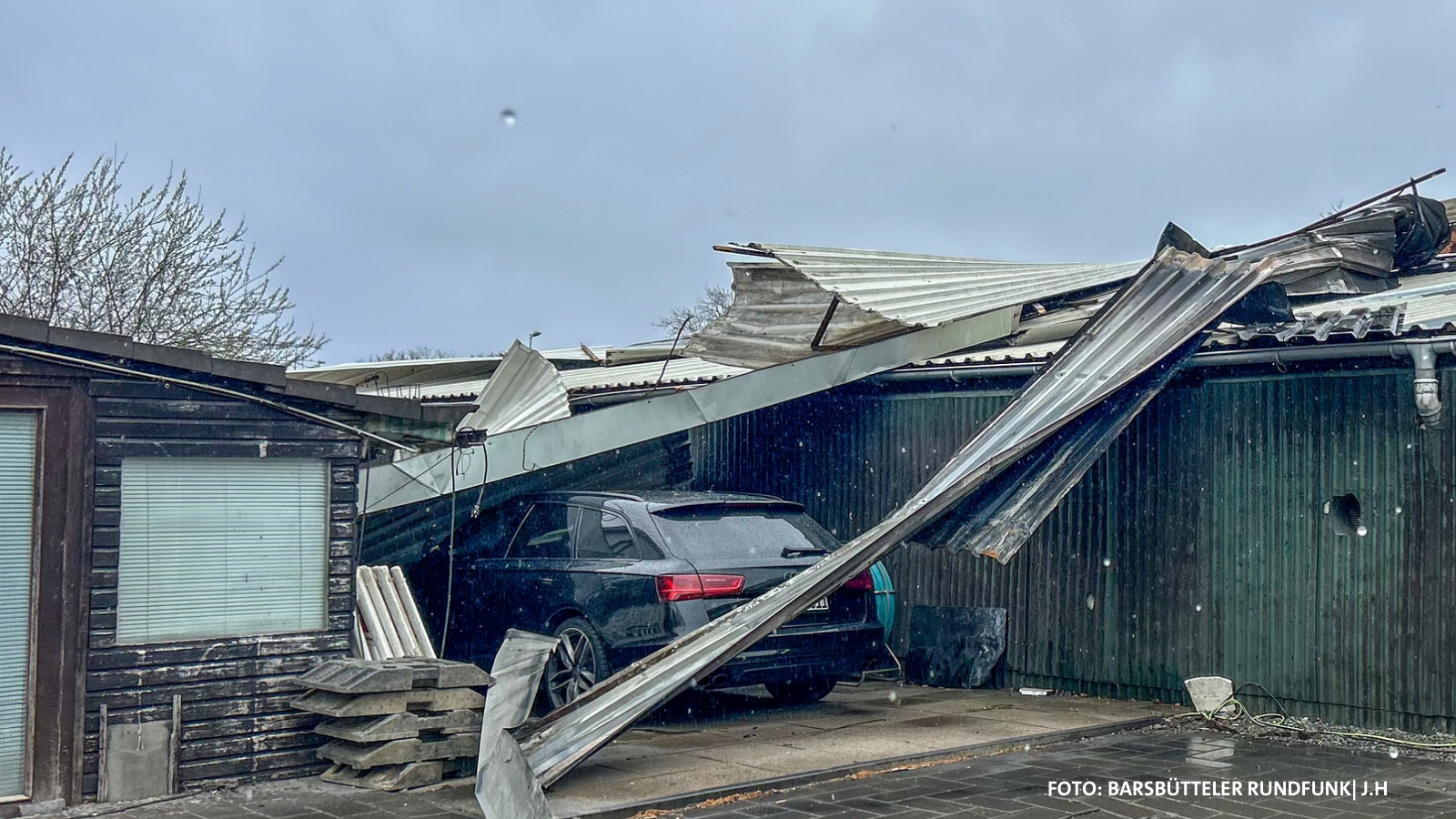 Besonders schwer sind die Schäden im Stadtteil Jenfeld: An einer bereits vor Monaten ausgebrannten Lagerhalle haben sich Teile des Daches gelöst und sind auf geparkte Fahrzeuge gestürzt. Ein Audi wurde dabei stark beschädigt. Trümmerteile verteilten sich auf der Rückseite des Gebäudes. Anwohner bemerkten den Vorfall am frühen Morgen gegen 7.30 Uhr.