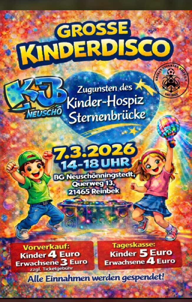 Reinbek-Neuschönningstedt – Am Samstag, 7. März 2026, findet im BG Neuschönningstedt erneut die große Kinderdisco statt. Veranstalter ist der Verein Kraken Stormarn Hilft e.V., der das Event bereits zum dritten Mal organisiert. Die Veranstaltung wird in Zusammenarbeit mit der KJB Neuschönningstedt und mit Unterstützung der Stadt Reinbek durchgeführt.