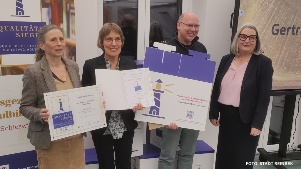 Die Auszeichnung nahmen Schulrektor Christian Naterski sowie die Lehrerinnen Cathrin Dwenger-Riesel und Evelyn Bodendiek, die die Bibliothek leitet, entgegen. Landesweit erhielten insgesamt acht Schulbibliotheken das Qualitätssiegel, darunter als zweite Einrichtung aus dem Kreis Stormarn auch die Kirsten-Boie-Schule in Barsbüttel.